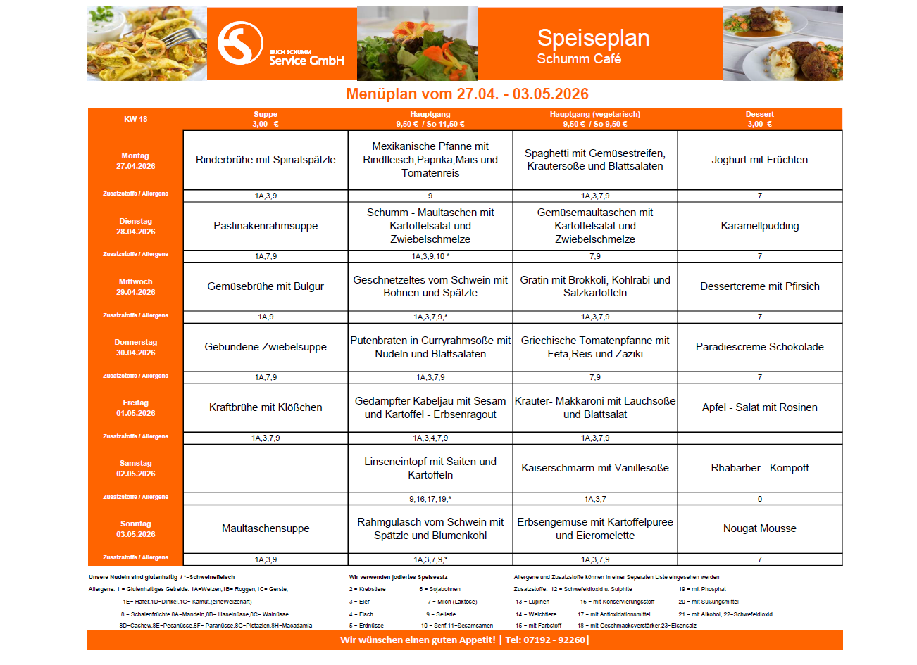 Speiseplan vom 27.04. – 03.05.2026 26.04.2026 | Aktuelles, Menüplan Speiseplan vom 27.04. – 03.05.202626.04.2026Aktuelles, Menüplan Speiseplan vom 27.04. – 03.05.2026 Hier herunterladen ← Speiseplan vom 04.05. - 10.05.2026